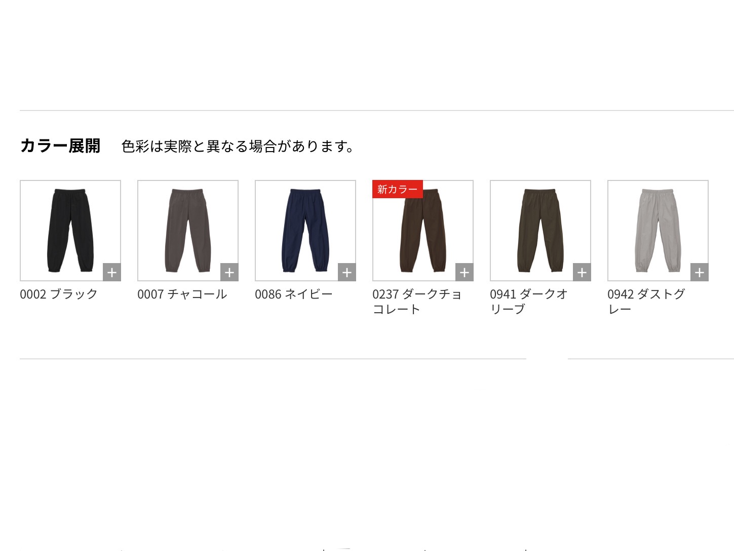 | Color | 0002-ブラック, 0007-チャコール, 0086-ネイビー, 0237-ダークチョコレート, 0941-ダークオリーブ, 0942-ダストグレー |