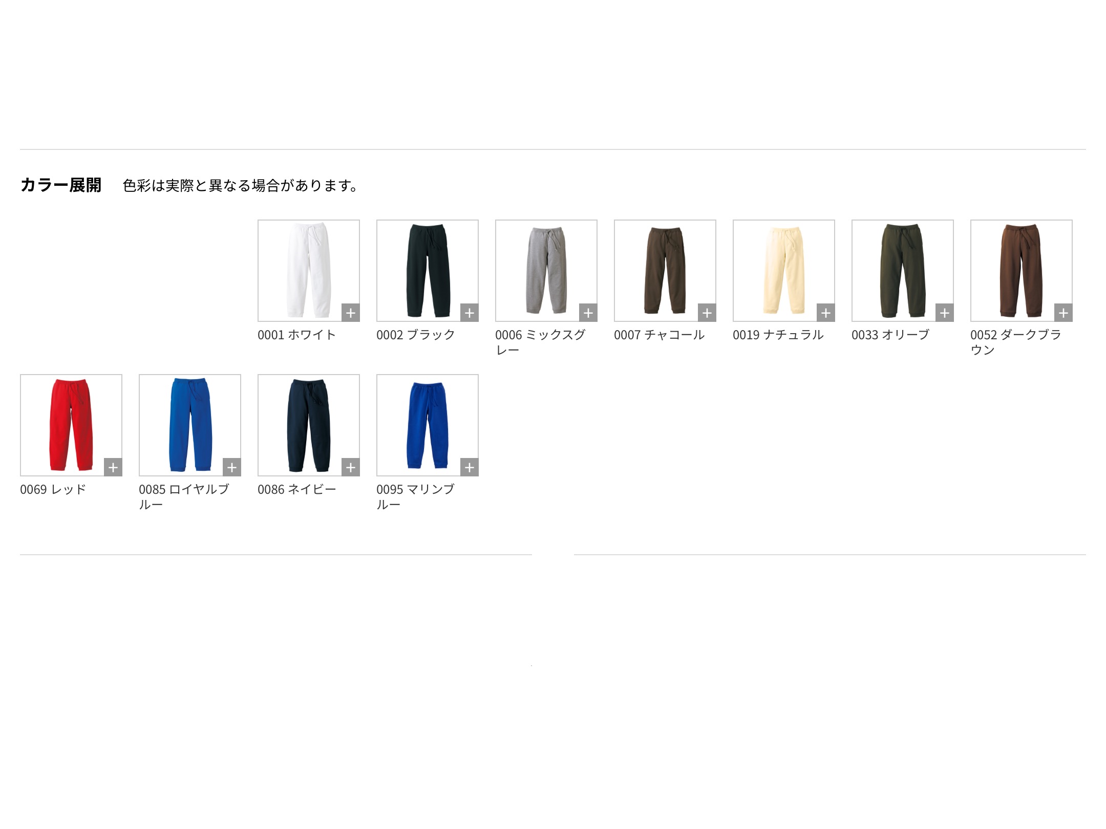 | Color | 0001-ホワイト, 0002-ブラック, 0006-ミックスグレー, 0007-チャコール, 0019-ナチュラル, 0033-オリーブ, 0052-ダークブラウン, 0069-レッド, 0085-ロイヤルブルー, 0086-ネイビー, 0095-マリンブルー |