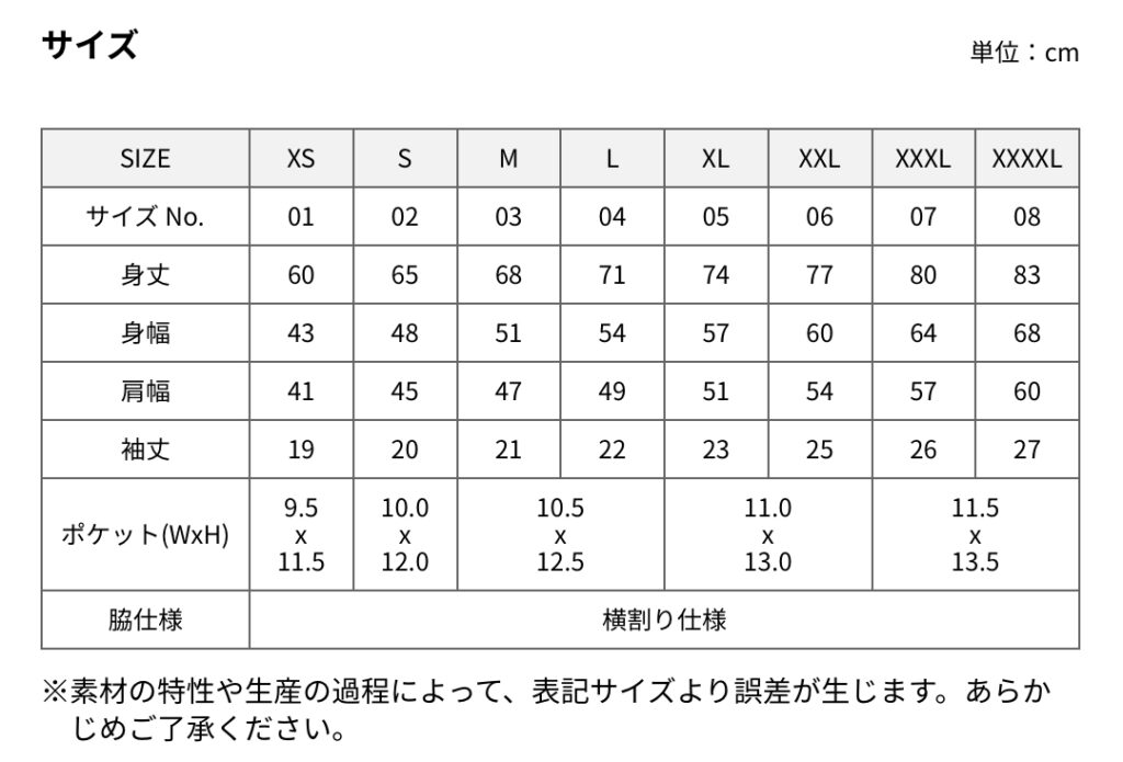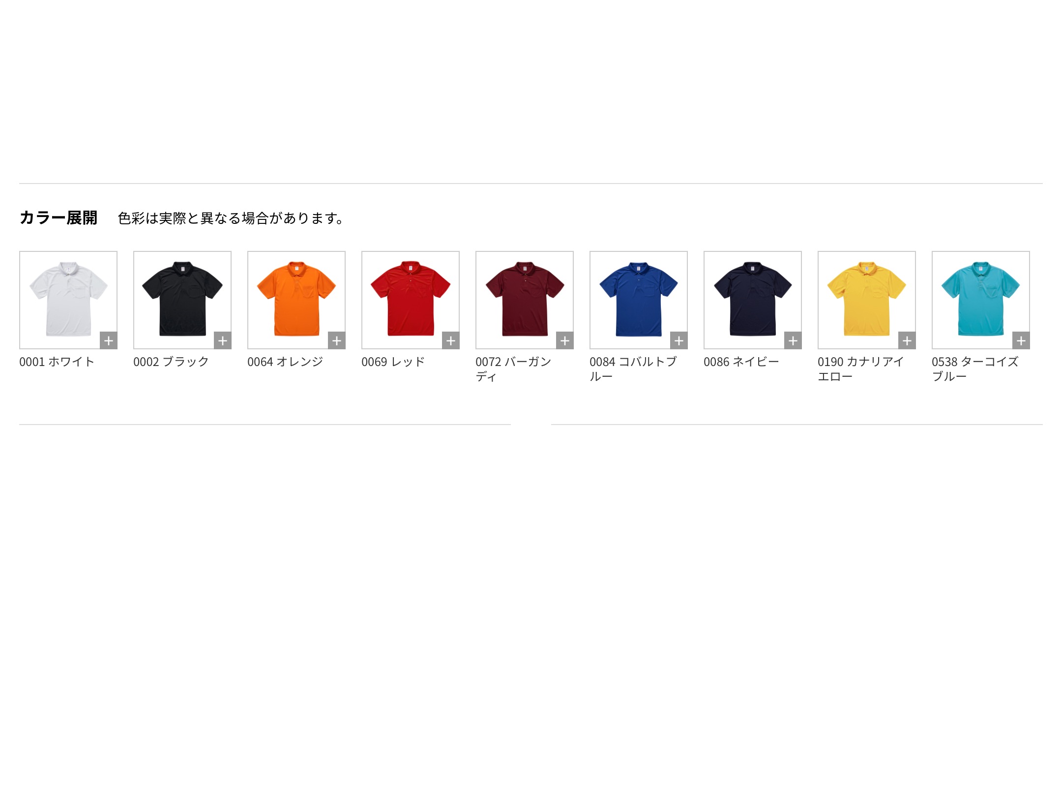 | Color | 0001-ホワイト, 0002-ブラック, 0064-オレンジ, 0069-レッド, 0072-バーガンディ, 0084-コバルトブルー, 0086-ネイビー, 0190-カナリアイエロー, 0538-ターコイズブルー |
