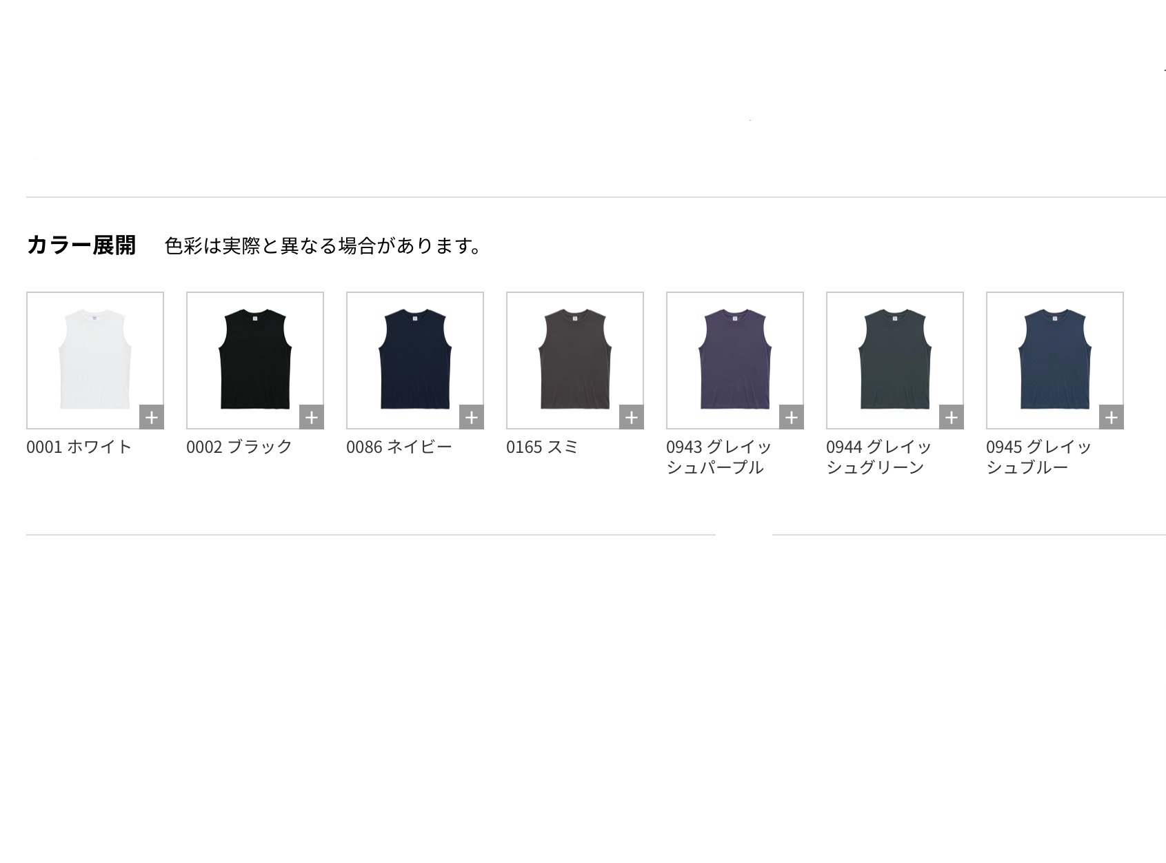 | Color | 0001-ホワイト, 0002-ブラック, 0086-ネイビー, 0165-スミ, 0943-グレイッシュパープル, 0944-グレイッシュグリーン, 0945-グレイッシュブルー |