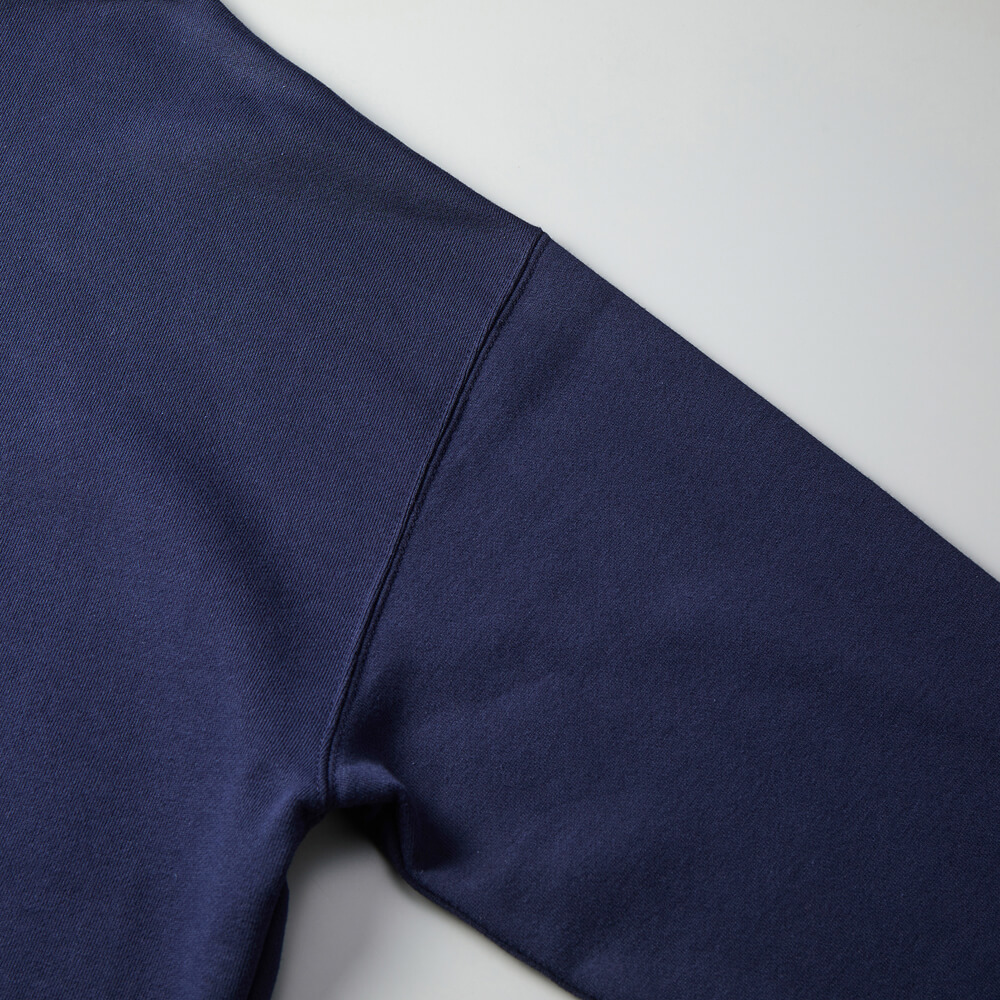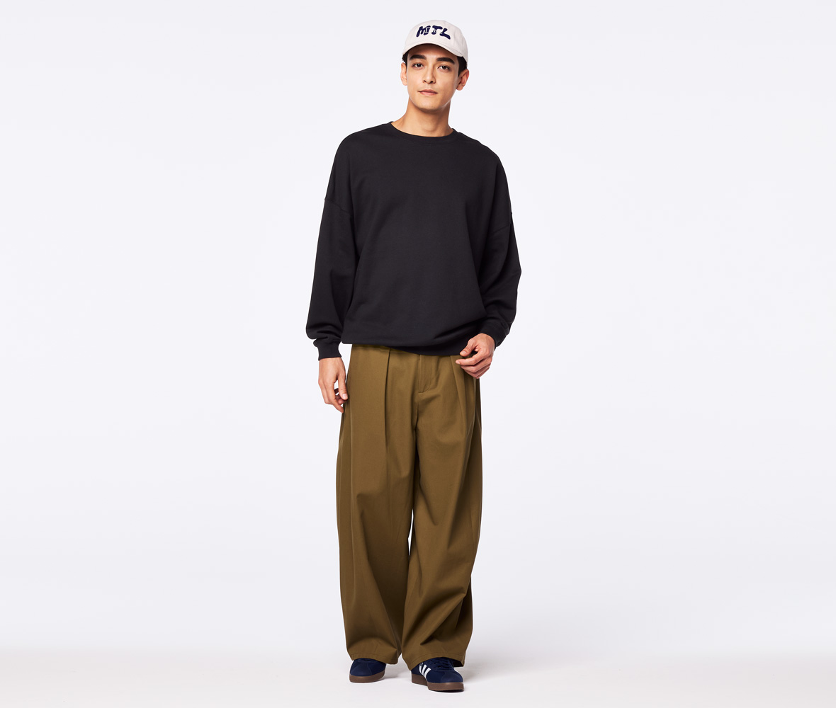 3シーズン着まわせる、ミドルな厚さと軽快な生地感が魅力のスウェット。裾まわりのシルエットが浮かないように絞り込んだ裾口や、ほどよい溜まり感のある袖、ストンとドロップするショルダーラインなど、シルエットの随所にこだわりを詰め込んだほか、首まわりはタフなダブルステッチを採用。トレンドコーデを1枚で完成させる絶妙なサイジングはもちろん、堅牢さも兼備したことで、ビッグシルエットアイテムの集大成となりました。United Athle定番の「10.0オンス 裏パイル スウェット シリーズ」生地での展開。