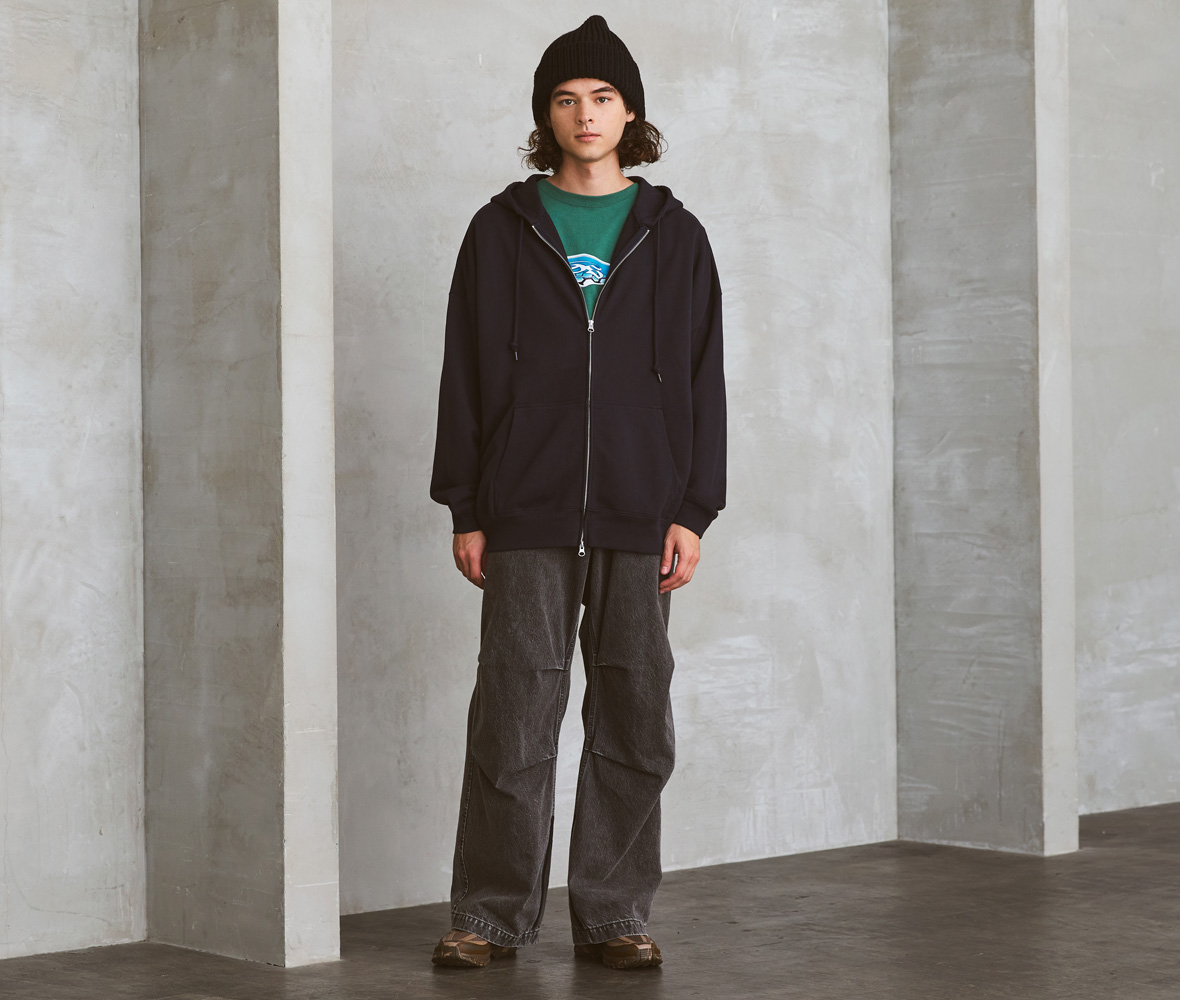5214-01をはじめとした、定番の「10.0オンス 裏パイル スウェット シリーズ」に仲間入りした、トレンドのビッグシルエットアイテム。さっと脱ぎ着ができることで着用シーン・コーディネートの幅を広げられ、トレンドのざっくりとしたシルエットを、さらに気軽に楽しむことができます。大きめフードやダブルスライダーのファスナーは存在感も使い勝手も抜群。フードひものチップ加工など、ディテールにも工夫を凝らしました。吸水性と伸縮性の高い裏パイル地は、10.0オンスと薄すぎも厚すぎもしない適度な生地厚。着用時期が長く、着回しのしやすさも嬉しいポイントです。