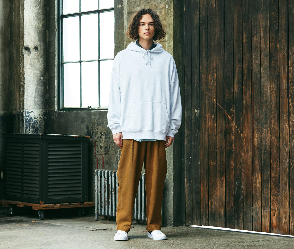 長らくトレンドスタイルの決め手として活躍してきた、秋冬コーデのキーアイテムであるビッグシルエットのスウェット。裾まわりのシルエットが浮かないように絞り込んだ裾口や、ほどよい溜まり感のある袖など、シンプルながら見どころは満載。絶妙に計算された大きめサイジングはもちろんのこと、フードひものチップ加工など、ディテールにも工夫を凝らしました。さまざまなスタイルに寄りそう、ビッグシルエットアイテムのニュースタンダードです。5214-01をはじめとした、United Athle定番の「10.0オンス 裏パイル スウェット シリーズ」生地での展開。