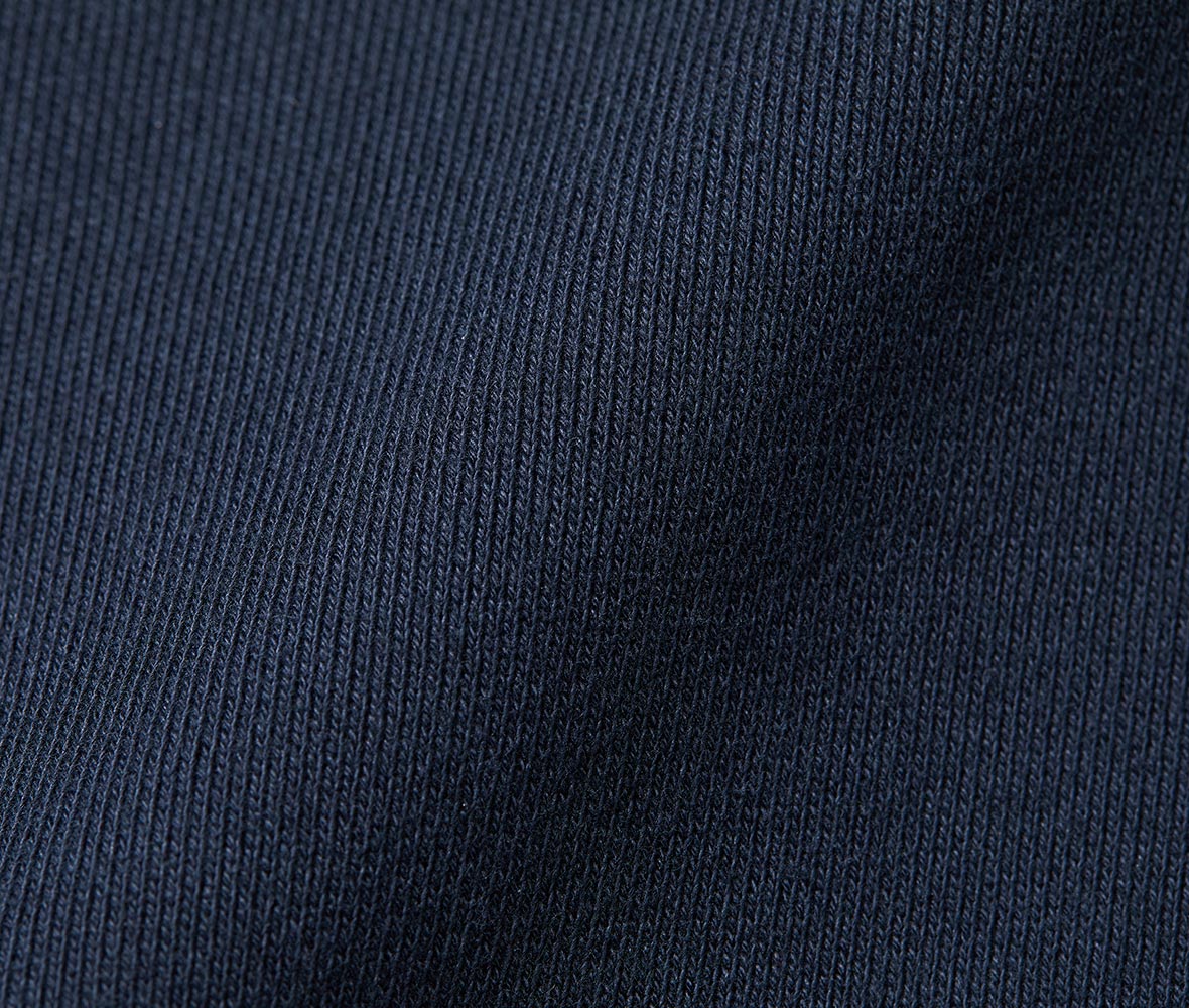 アーバンテイストでデイリーに着回しができる、ややざっくりなシルエットが特徴です。生地感はふっくら、裏糸のパイルは通常よりも太い糸を編み込み重厚感ある生地でどこかクラシックな佇まいも◎。また、洗濯後の縮率を軽減させるため、生地水洗いとタンブル乾燥を製造行程で施した「プリシュランクファブリック」を採用。アームホールや袖口など、力が加わる部分のステッチワークは太番手の縫製糸と粗めの運針数でダブルステッチにすることで、堅牢さと立体感を実現しました。