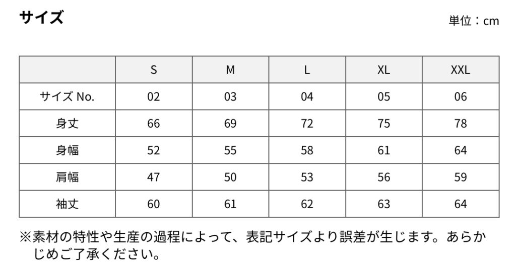 | Color | 0001-ホワイト, 0002-ブラック, 0005-アッシュ, 0006-ミックスグレー, 0086-ネイビー, 0210-ストーンブルー, 0545-サンドベージュ |