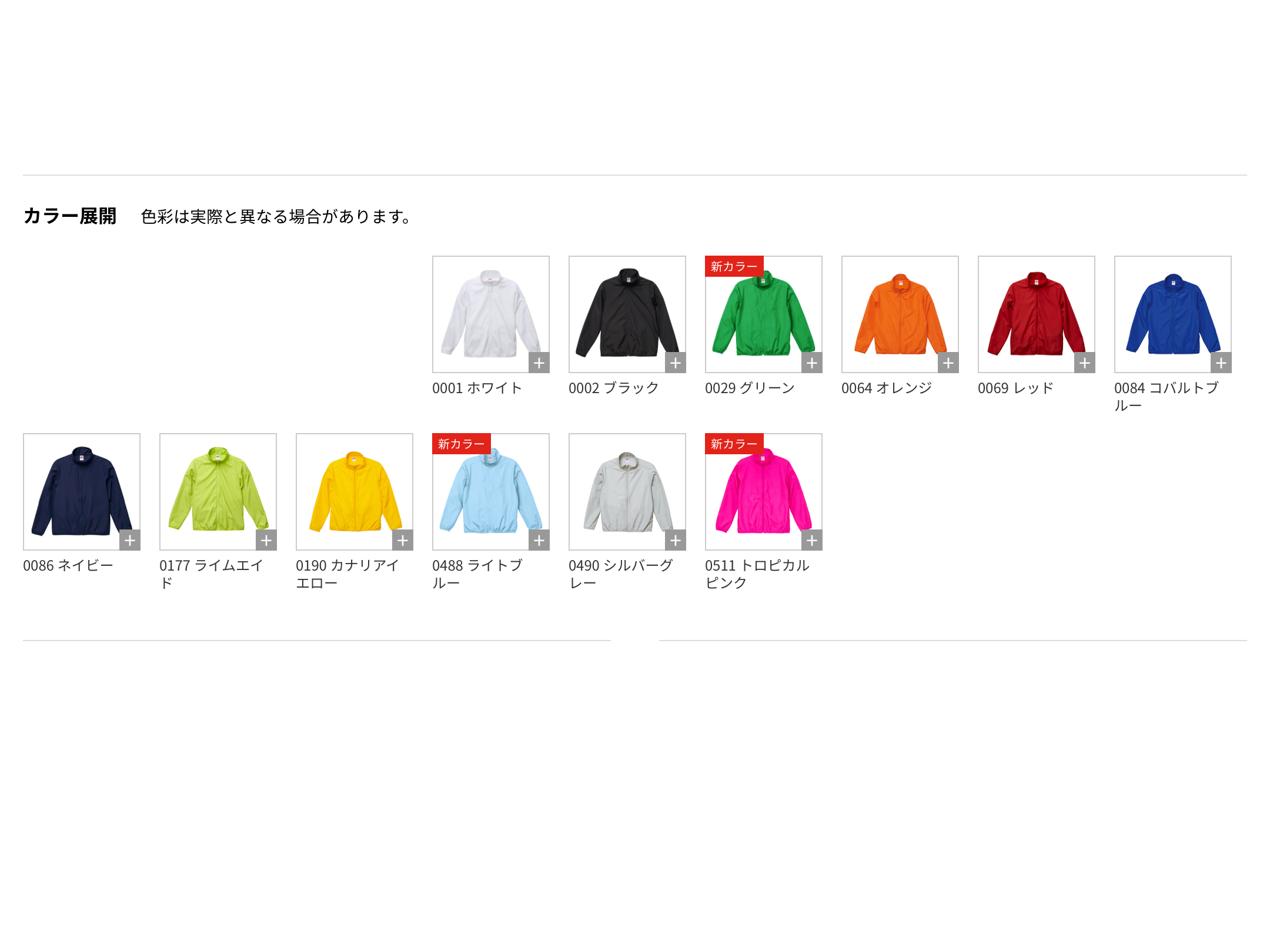 | Color | 0001-ホワイト, 0002-ブラック, 0029-グリーン, 0064-オレンジ, 0069-レッド, 0084-コバルトブルー, 0086-ネイビー, 0177-ライムエイド, 0190-カナリアイエロー, 0488-ライトブルー, 0490-シルバーグレー, 0511-トロピカルピンク |
